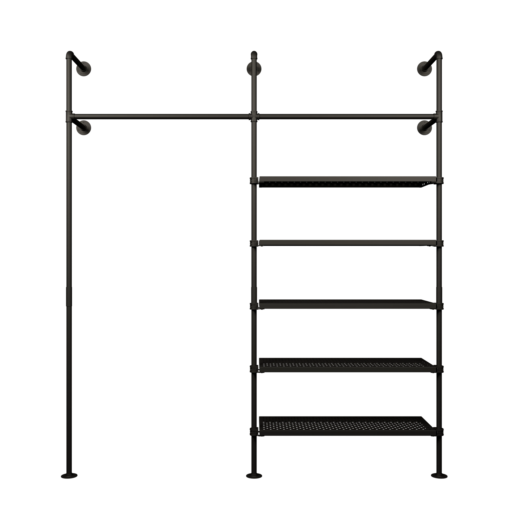 Create a versatile storage space for all your clothes with our KIM 2 METAL 5 wall shelf with clothes rail. Here at pamo., we offer thoughtful and high-quality furniture made from pipes that bring rustic New York loft design into your home. Get an organized overview of all your clothes with the wall shelf and clothes rail, and opt for an open wardrobe with a practical shelf for pants, shoes, or boxes.